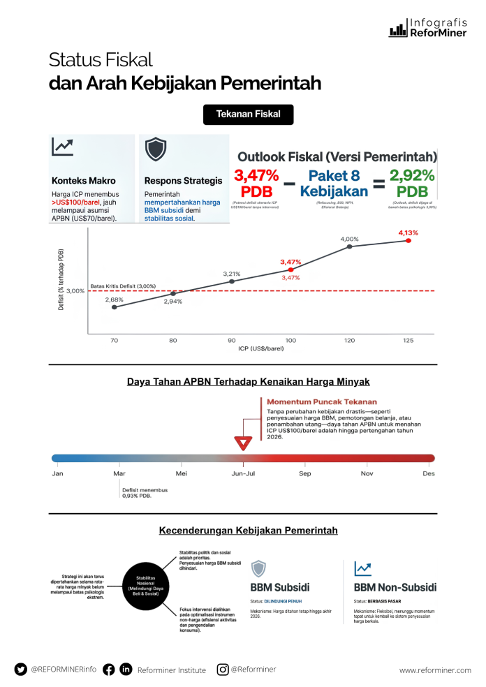 HomeInfografis-SimulasiStatus Fiskal dan Arah Kebijakan Pemerintah Infografis-SimulasiMinyak dan Gas Status Fiskal dan Arah Kebijakan Pemerintah By Admin April 18, 2026 0 12 Share FacebookTwitterPinterestWhatsApp Share FacebookTwitterPinterestWhatsApp Previous articleKeseimbangan Pasar dan Harga Minyak GlobalNext articleDaya Tahan Pasokan dan Durasi Konflik Global Adminhttp://www.reforminer.com/ RELATED ARTICLES Minyak dan Gas Respon dan Kebijakan Harga BBM ASEAN terhadap Lonjakan Harga Minyak Global April 18, 2026 Minyak dan Gas Dampak Tarif Tol Hormuz terhadap Harga Minyak April 18, 2026 Infografis-Simulasi Keseimbangan Pasar dan Harga Minyak Global April 18, 2026 LEAVE A REPLY Cancel reply Comment: Please enter your comment! Name:* Please enter your name here Email:* You have entered an incorrect email address! Please enter your email address here Website: Save my name, email, and website in this browser for the next time I comment. Δ Most Popular Respon dan Kebijakan Harga BBM ASEAN terhadap Lonjakan Harga Minyak Global April 18, 2026 Dampak Tarif Tol Hormuz terhadap Harga Minyak April 18, 2026 Daya Tahan Pasokan dan Durasi Konflik Global April 18, 2026 Keseimbangan Pasar dan Harga Minyak Global April 18, 2026 Load more Recent Comments